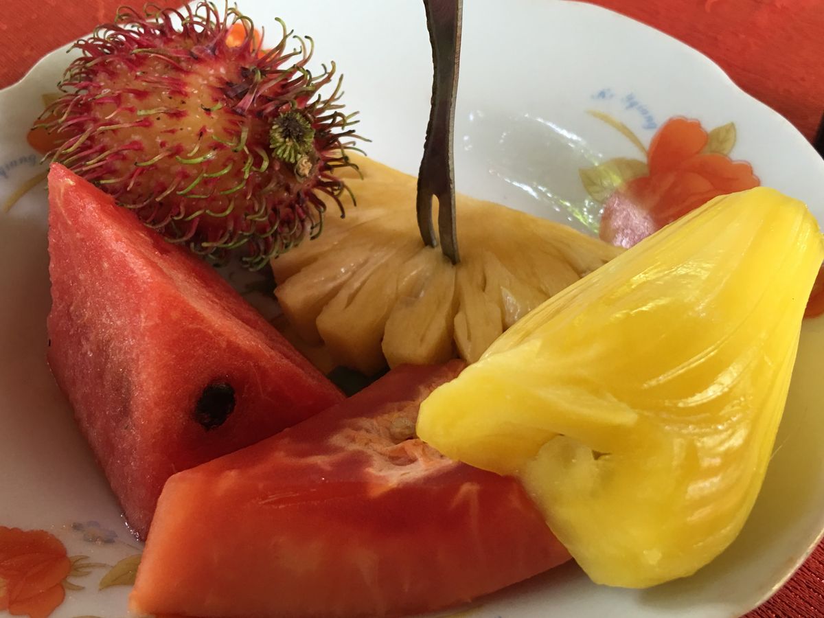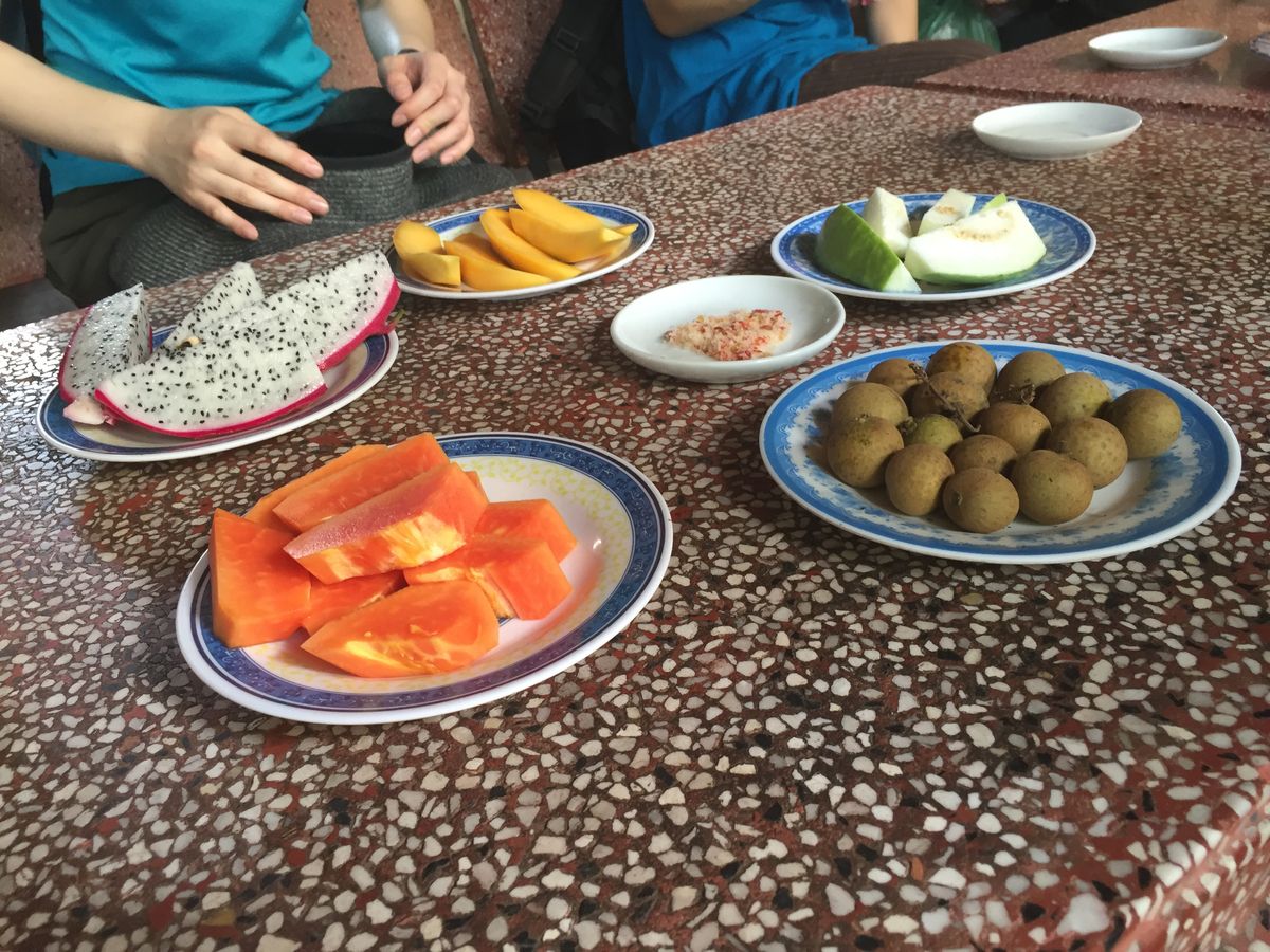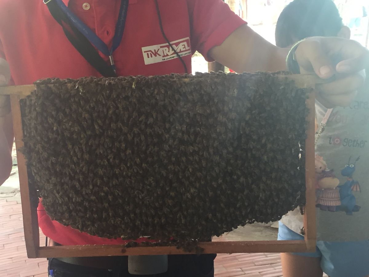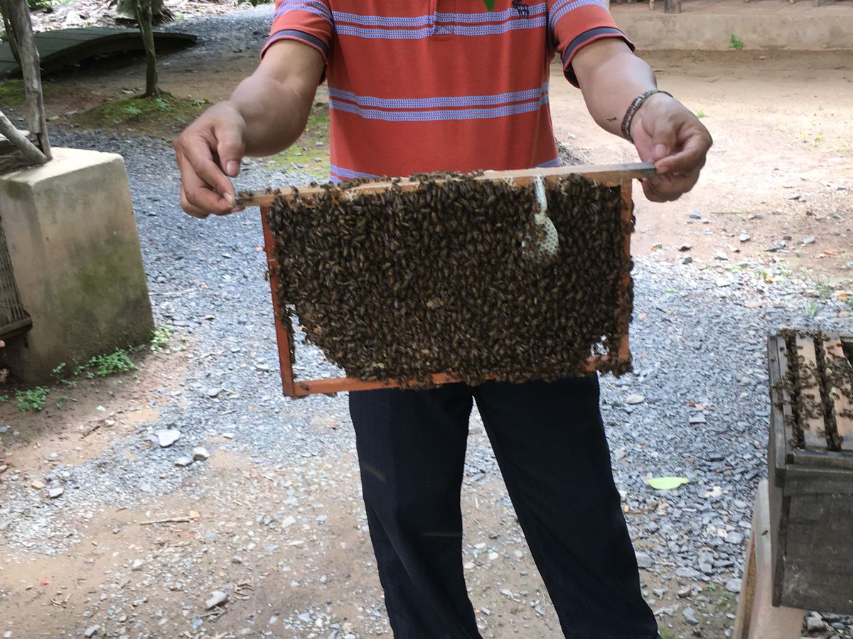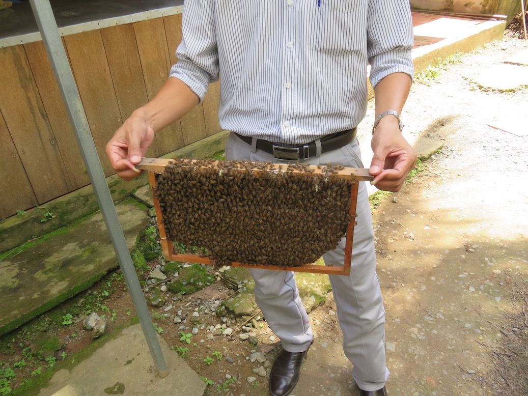 蜂の巣箱を持たせてもらいました。蜂が食べる花によって味が違うため、一年中様々な味が楽しめるそうです。途中の道に、ココナッツ、ライチ、ザボン、ジャックフルーツがたくさんなっていました。