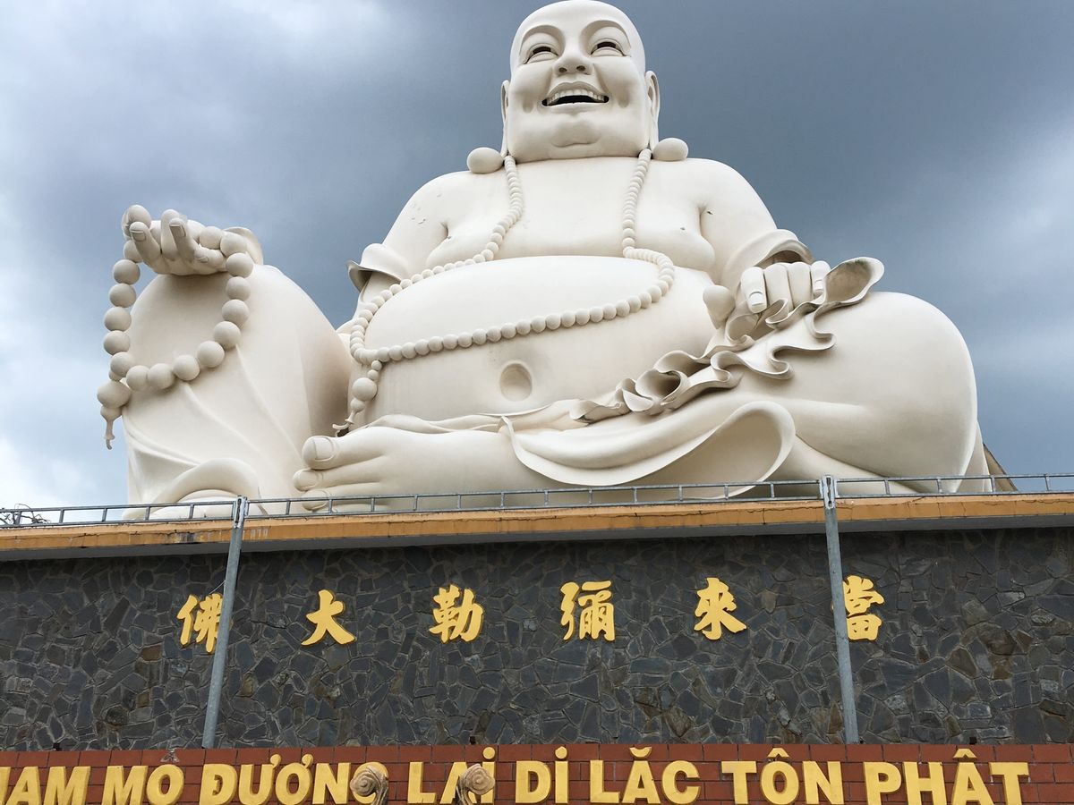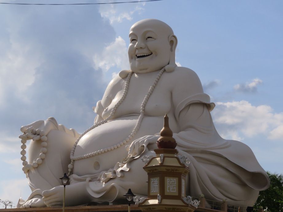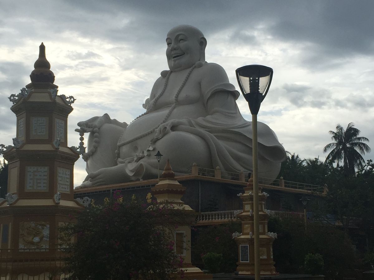 とてもカラフルなお寺です。仏像も大きく、建物が派手でテーマパークっぽい。中ではちゃんとお坊さんがお勤めしています。