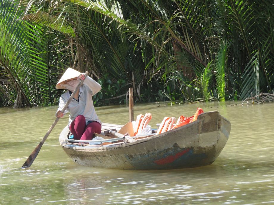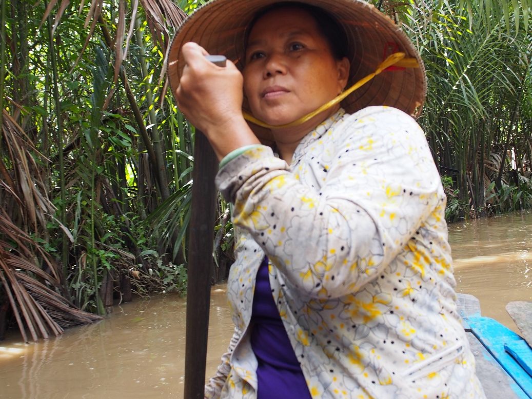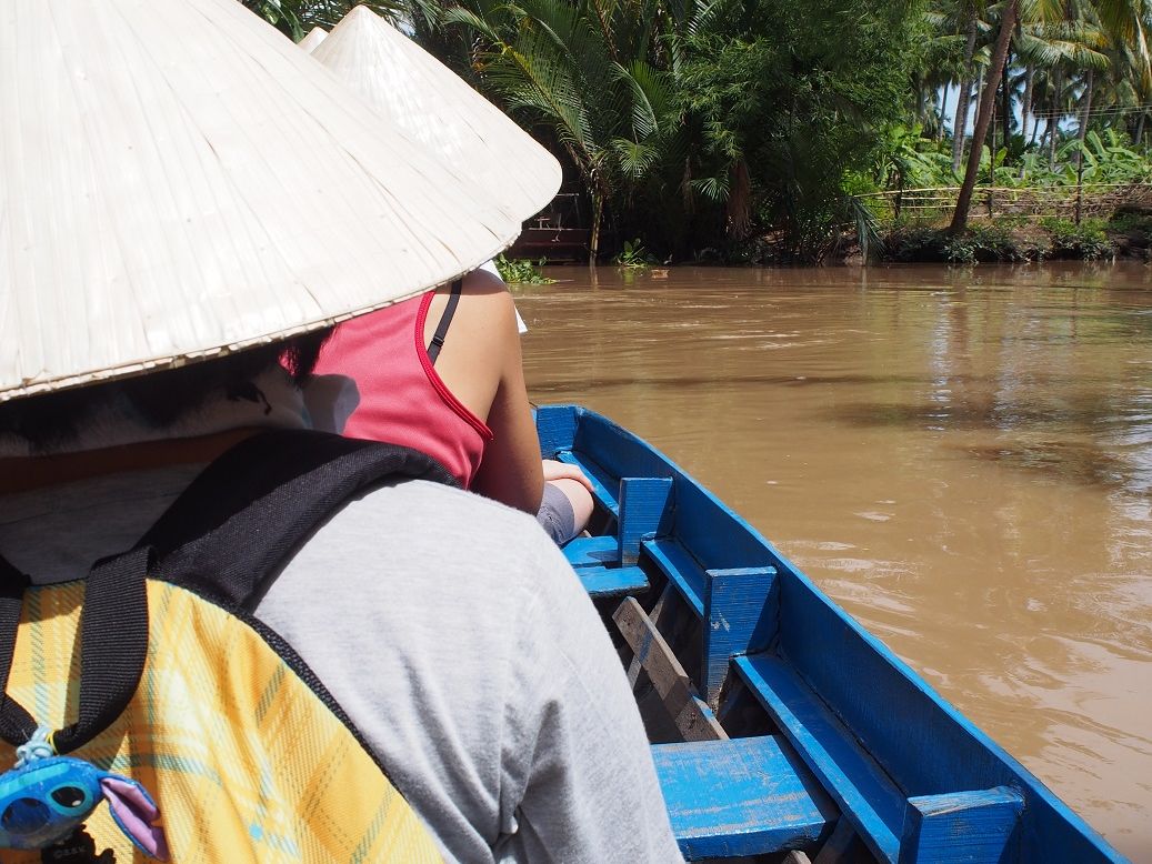 1人が傾くと船がひっくり返りそうで、スリル満点。船頭さんはたぶんベトナム語だけみたいですし、途中に何が出てくるわけでもないので、静かに船で進みます。ノンラーは軽くて、涼しく、髪の毛も潰れないし、少しベトナム人になった気分でした。