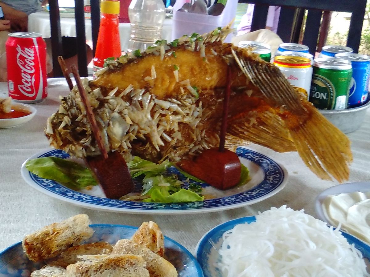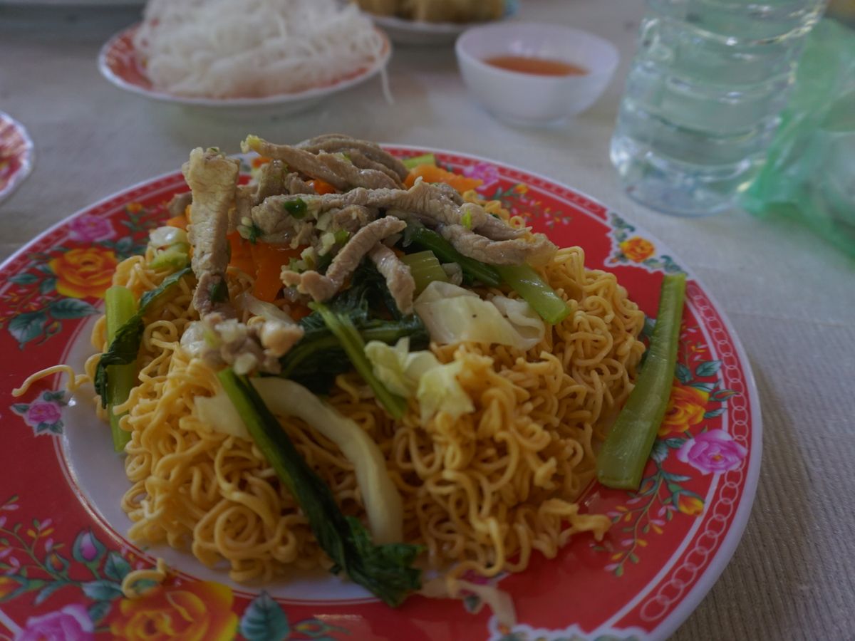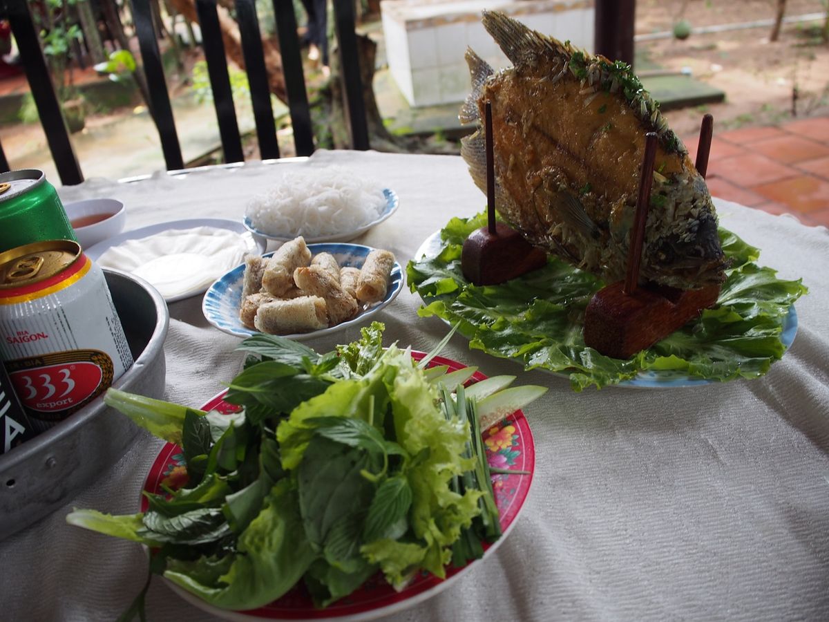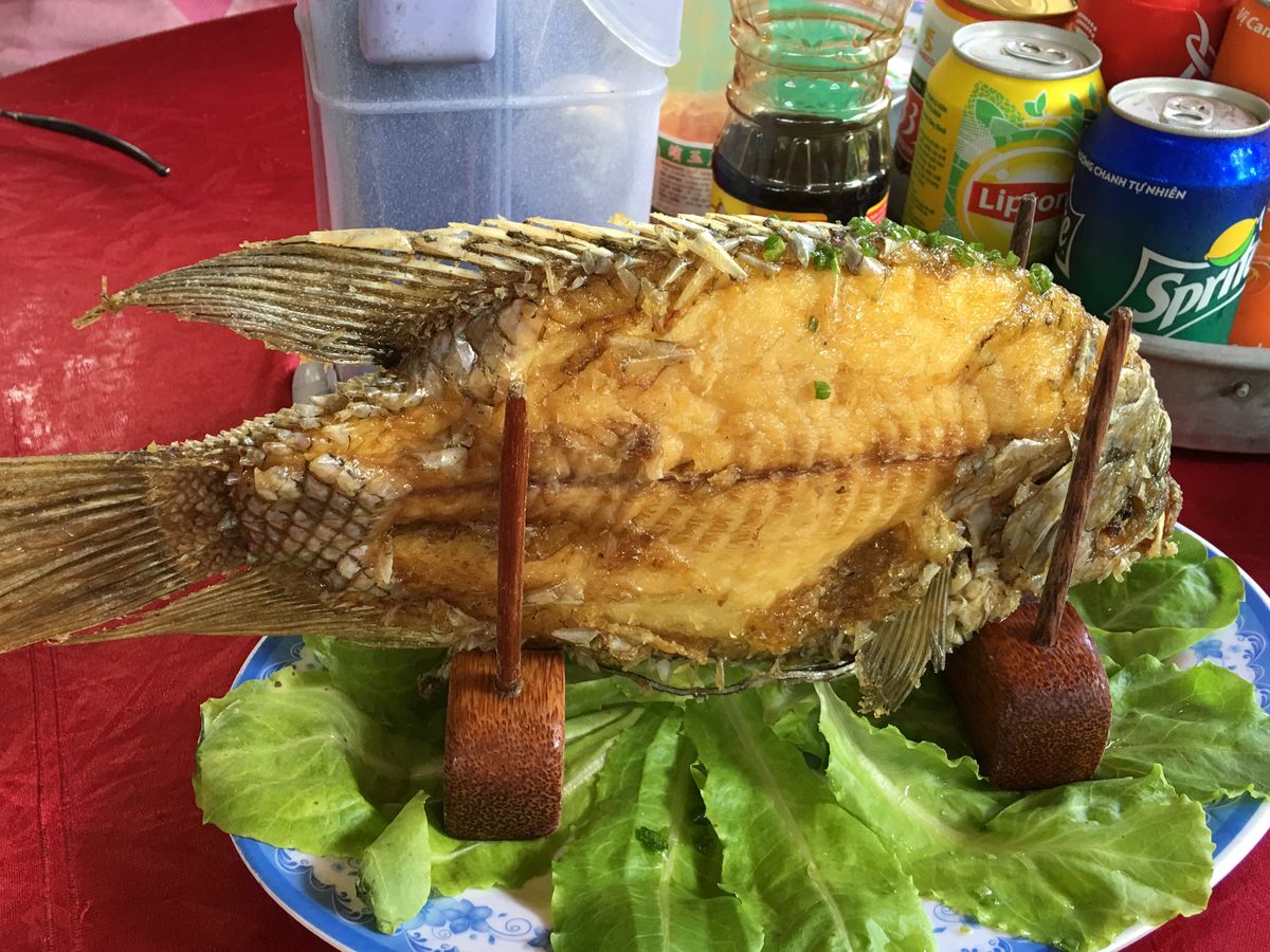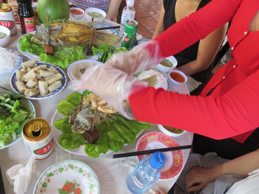 揚げた魚が立って運ばれてきた時は、どうやって食べていいのか分かりませんでしたが、ガイドさんがさばいてくれました。淡白でクセのない味。揚げ春巻き、焼きそば、スープと一緒に。
