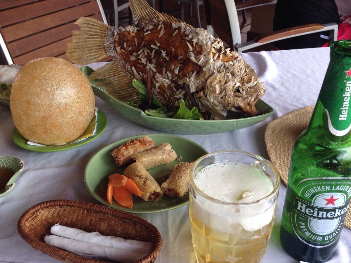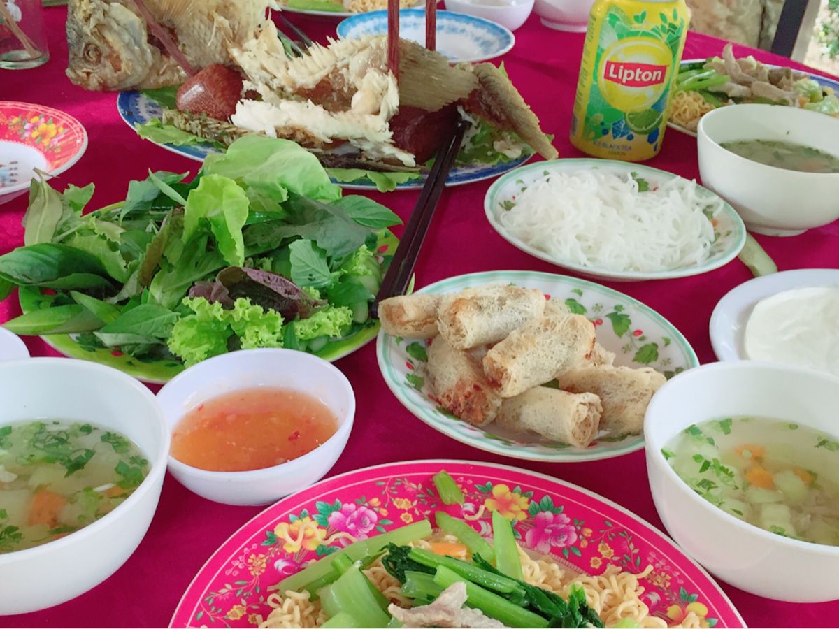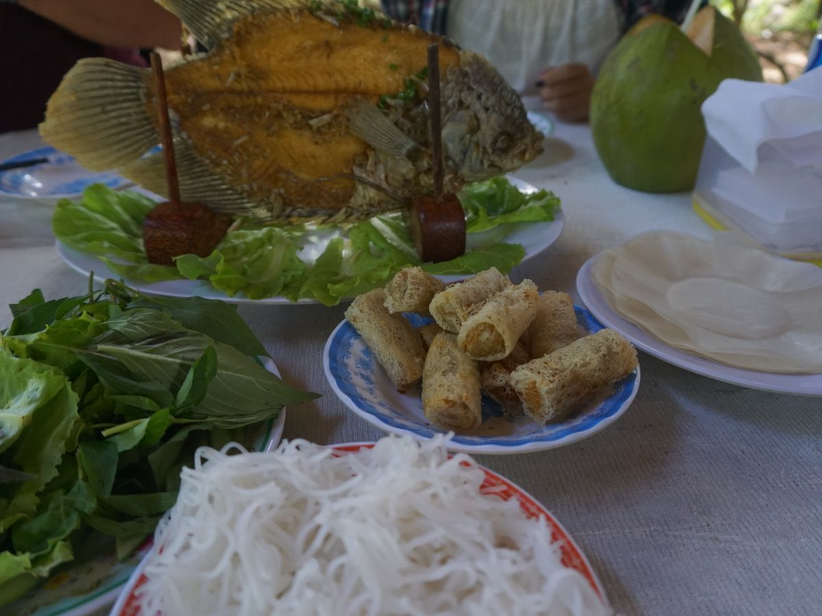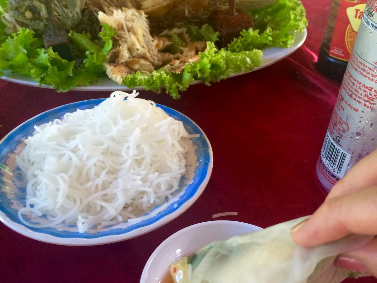 揚げた魚が立って運ばれてきた時は、どうやって食べていいのか分かりませんでしたが、ガイドさんがさばいてくれました。淡白でクセのない味。揚げ春巻き、焼きそば、スープと一緒に。