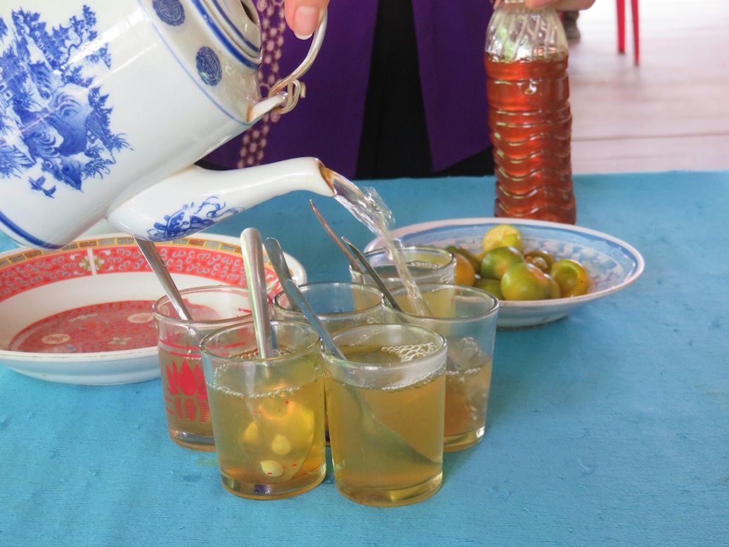 はちみつに金柑を搾ってお茶でわった、はちみつ茶と果物を頂きながら、伝統音楽の演奏と歌。