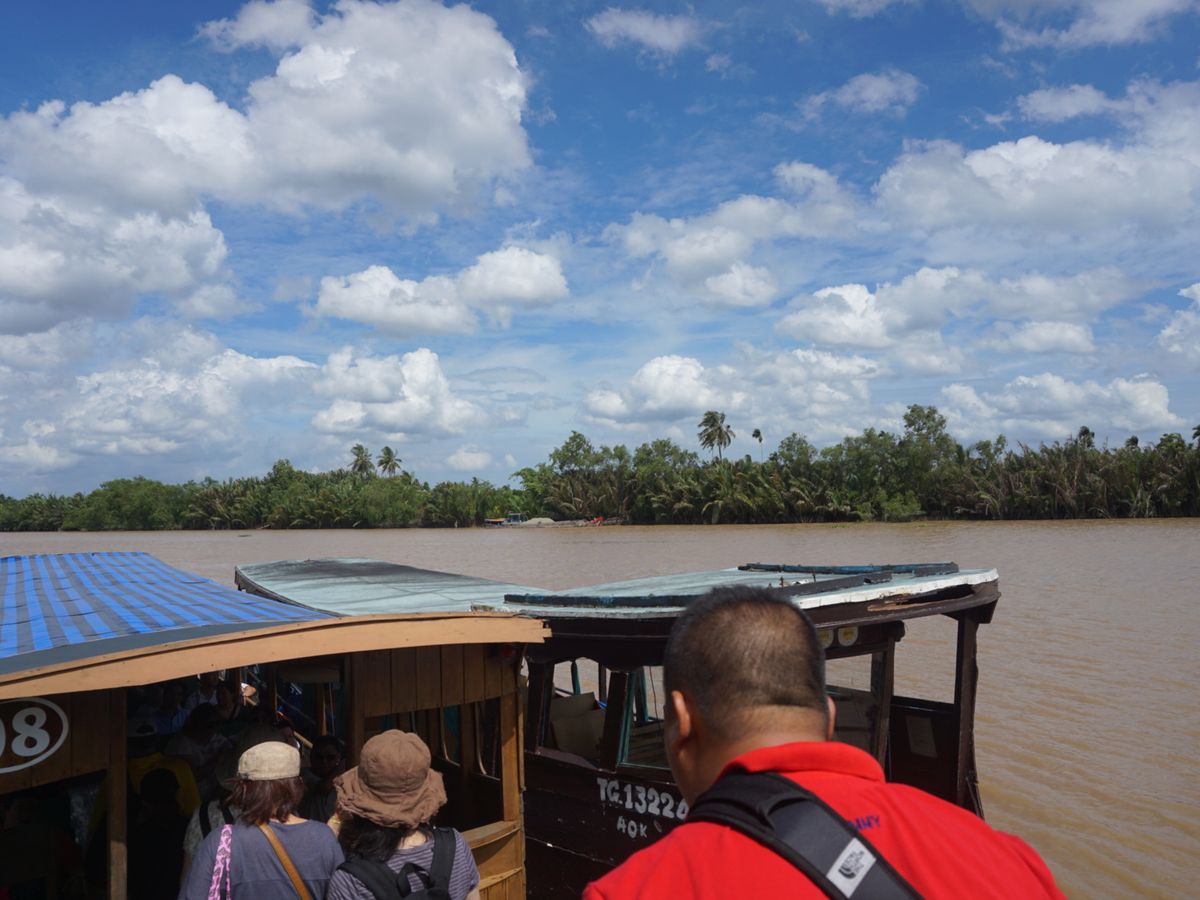 大きな船で移動。川幅が広く、風が気持ちよかったです。水が茶色いのは泥が舞っているだけで、水はとてもきれいなのだそう。船に乗っていてもまったく臭くなかったです。途中、ココナッツ教の建物が中州に見えました。