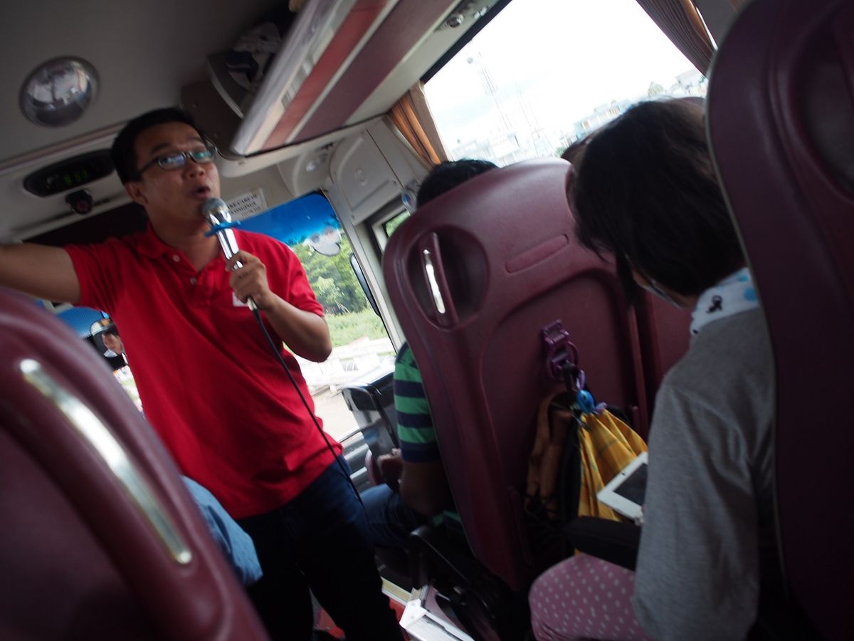 ホテルまで迎えに来ていただき、途中で大きなバスに乗り換え、またバスターミナルでメコン川ツアー用のバスに乗り換えました。総勢40人ほど、10人ぐらいが日本人であとは様々な国の方たち、日本語と英語のガイドさんが一緒です。