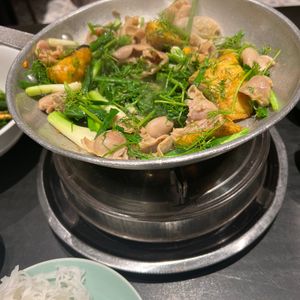 チャーカー:魚の身と胃袋を数種類の香草で炒めて、ブンやナッツとナンプラーを混ぜて食べます。