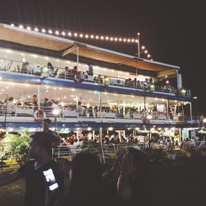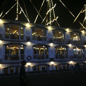 その後はナイトクルーズ。船のスタッフは全員制服で統一していて、一緒に写真も撮れます!。苦手なものがあれば外してくれる親切な店なので、食物アレルギーあれば事前にガイドさんに伝えておきましょう。夜も料理は美味しい!。フロアが分かれていて、静かな三階に案内してもらえました。各フロアでミニステージがあり、歌やダンスをやっていました。もちろん夜景も楽しめました。