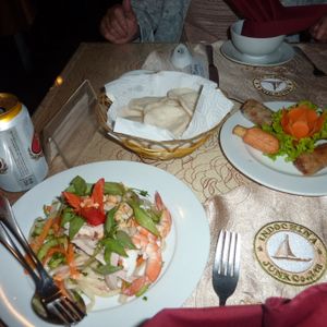 ”象耳魚”を揚げたもの(春巻きを作ってくれます)、お餅のようなもの、フォー(甘め薄味)、プリン等が出ます。