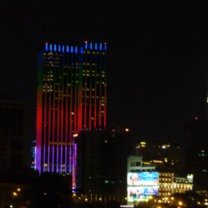 カニスープ、エビと豚肉入り野菜鍋、肉巻き、スイカとパイナップル等、コース料理のような内容です。ドリンクは別料金。私たちはスイカジュース22,000ドンを頼みました。高層ビルのライトアップ等、綺麗な夜景が楽しめます。