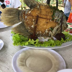 今回の旅行で一番楽しみにしていました。指定ホテルでピックアップして頂き目的地のミトーへ。メコン川は雨季は今回の茶色、乾季は緑色になるとのこと。ハチミツ農園で休憩し、ニシキヘビを首にかけたり、ココナッツキャンディの工場見学、メコンデルタ川クルーズは狭いながらも楽しかったです。その後はランチタイムと気になっていたエレファントイヤーフィッシュの登場。生春巻きにしてお店の人が巻いてくれました。味付けは臭みもなくあっさりしています。他にもあげ春巻き、そうめん等でました。