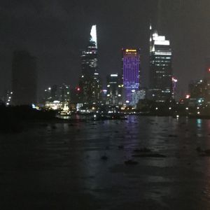河を行きかう他船の景色が美しく経済の躍動を感じる近代意的な高層ビル群の夜景も