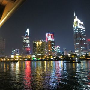 ディナークルーズ船から眺めるホーチミンの夜景は、サイゴン川の水面に映し出されるビル群のライトアップと相まって