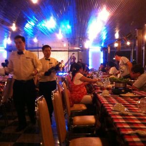 ディナークルーズは、いくつかある船のなかでも一番豪華な、趣味のいい船でした。ランタンがたくさん灯り、木造の素敵な3階建てです。料理もいいですし、給仕もよかったです。一番上の階は、ゆったりくつろげるオープンエアになっていました。食後は自由に動き回れましたよ。
