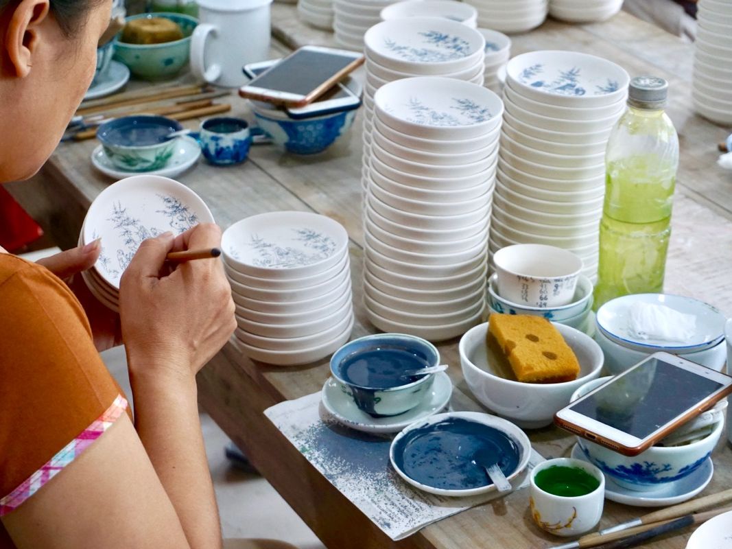 バッチャン村では、建物の3階が工場となっており、絵付けの工程などを見学することができました。1階では手頃な価格の陶器が売っていましたが、2階には高価なアンティークの陶磁器が置いてあり、どれも味わい深く見事なものでした。