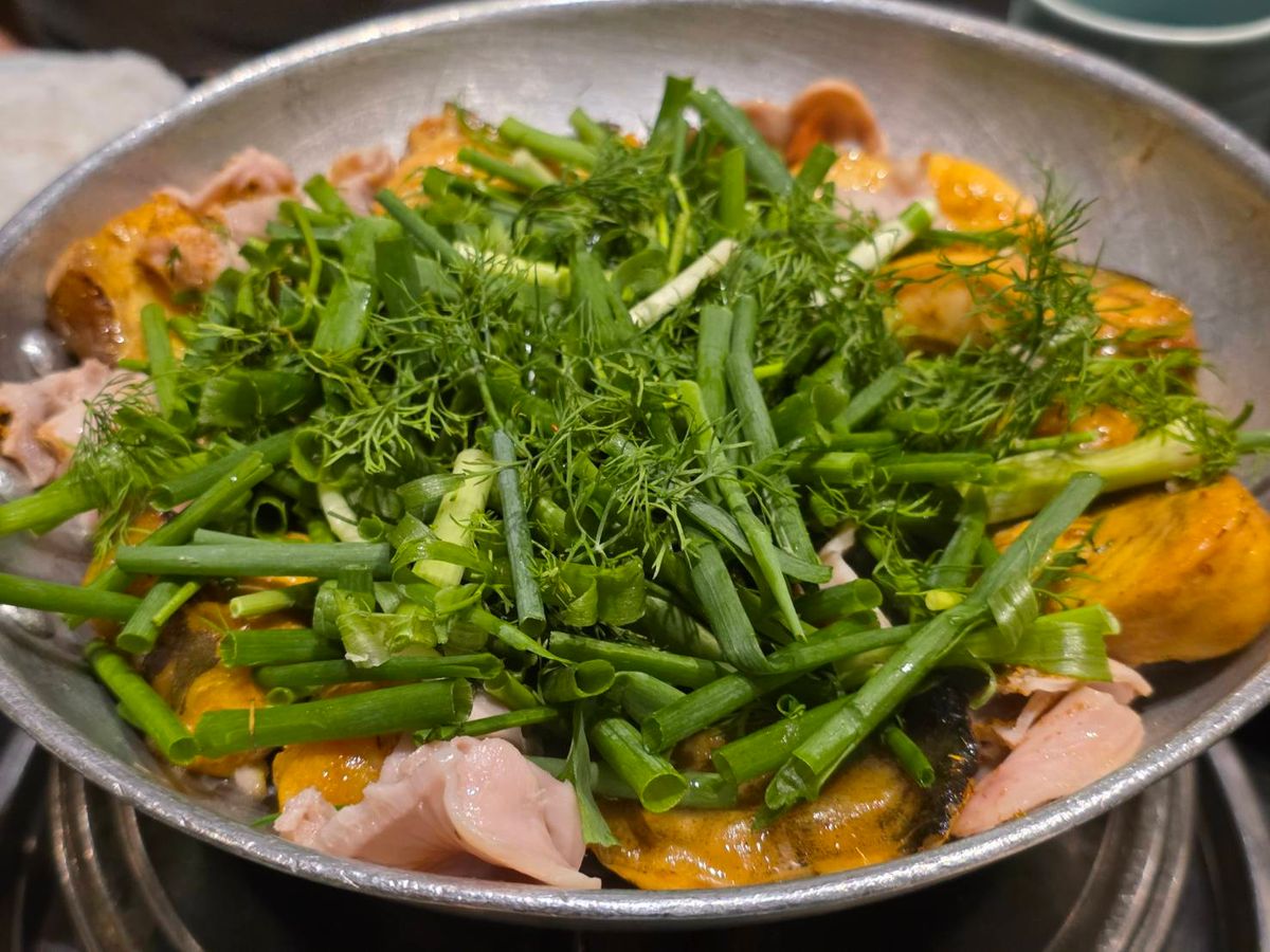 チャーカーという料理で、魚や青菜や香草を鍋の中で炒めていきます。