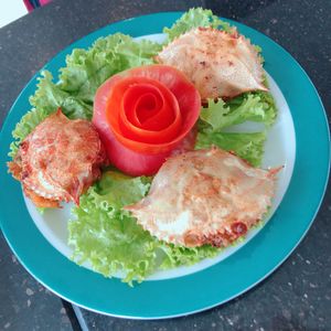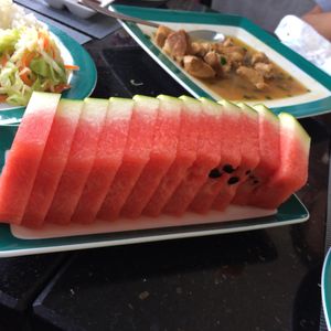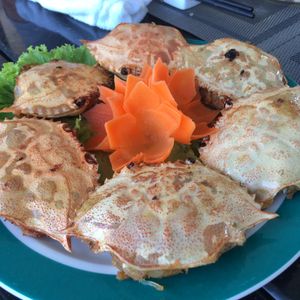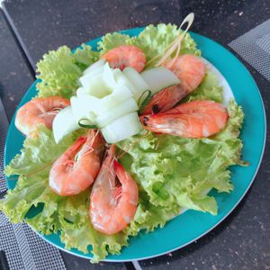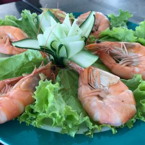 船内でのご飯です。エビやカ二が出ました。大皿を5〜6人で取り分ける形でした。悪くはありませんが、街中の物価を考えると、もう少し豪華でもよいかな…と。量的にも少し少なめです。ドリンク類は別料金なのでミネラルウオーターにもお金が要ります。