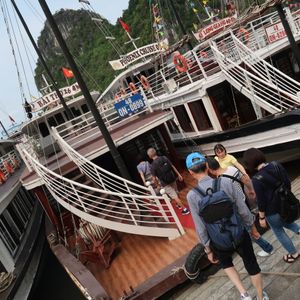 ひとり旅で参加しました。移動バスはとても大きくて広かったので快適でした。WiFiもついていたのでありがたかったです。まずバッチャン村に行きます。観光地として有名なのでほとんどの店員さんが日本語を話されます。ずっと付いてくるので押し売りがすごかったです。バッチャン焼きをたくさん買う予定の方にはもってこいかもしれませんが、学生のひとり旅のわたしには少ししんどかったです。道中はトイレ休憩と称したお土産やさんに何回か立ち寄ります。ここでも日本語での押し売りが凄まじいです。ハロン湾の港に着いて船に乗るとすぐに昼食です。4人1グループでシェアという形でした。そこまで量は多くなかったです。昼食を終えたら自由に外に出て良いのですがみんなが一斉に出てくるので狭いという印象でしたが、ハロン湾の風景は非常に良かったです。ハロン湾クルーズが終わると鍾乳洞に案内されます。個人的にハロン湾よりもこちらの方が楽しかったです(笑)また船に乗りバスに戻ります。ガイドさんの日本語もお上手でギャグとかも言ってくださるのでおもしろかったです。sonさん最高でした!自然ってすごいと思わされるツアーだったので参加して良かったです。いい思い出になりました!!