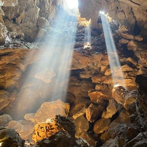 鍾乳洞は、高さも有り広く綺麗でした。広場の天井から、光の柱が立っていて、天国への階段のようでした。とても綺麗で幻想的な光景でした。滅多に見れないと言われてとてもラッキーでした。