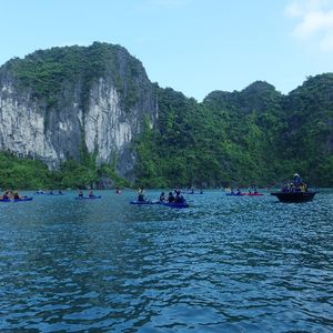 次のイベントはシーカヤックか手漕ぎボートが選択できた。ガイドさんからは、どうやっても水に濡れる、自分で漕ぐので疲れるいった説明を聞き、多くが手漕ぎボートを選択した。こちは船頭さんが漕いでくれるので、安心して参加できるのだ。岩山の水面近く、頭がぶつかりそうなくらいのスペースを通過するので、ある程度経験がないとカヤックは厳しいと感じた。わざと船を揺らして楽しむ船頭さんもいて、色々な楽しみ方ができるツアーであった。