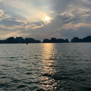 ここを出発すると真っ直ぐ港に戻るのであるが、途中夕陽を見ながらのカクテルタイムがあった。当日は雲が多く美しい夕陽とまではいかないが、海風が心地よく、ハロン湾の島々をすり抜けながら非常に贅沢な時間を過ごすことができた。