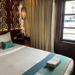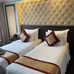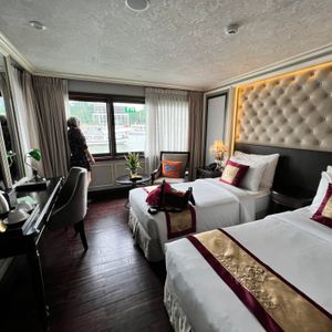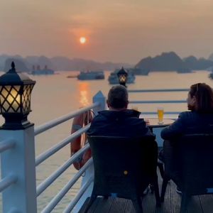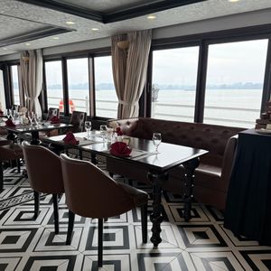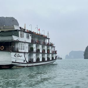 クルーズ船を検討中に、どの1泊2日クルーズが予約不可能になりました。一つだけ可能な、口コミ悪い格安クルーズに参加することになりました。会社との連絡方法はWha'ts Appでしたが、直前にアプリ登録完了しませんでメールで連絡が取れました。滞在先ホテルへメール内容通りの時間に迎えに来てくれました。乗車バス内はシートもリクライニングが壊れているが渋滞なく、高速道路パーキングエリアでトイレ休憩。真珠センターに寄り、クルーズ出港まで時間通り。ガイドさんには英語があまりできないと予め申告したので、気に留めてくれました。ハロン湾内クルーズ船まで、小舟で移動。申し込んだ部屋はバルコニー付きデラックスルームでしたが、なんと!バルコニー無し。ガイドさんに話すと、「この船はバルコニーが無いから申し込み会社にクレ-ムを言ってください。」少したってから船の後ろのバルコニーとは程遠い椅子二つと小テ-ブルが外付けの部屋へ交換。(クレ-ム遅くなりましたが…)バスル-ムのドアが壊れている、換気扇から漏電かと思う電気がバチバチ火花が。夜、食事はあっさりと終わり、夜中までカウントダウンを楽しみにしていましたが盛り上がりの無い終わり方でした。アクティビティ-はネット予約記載より省略あります。他のクルーズ船のような豪華さは全くありません。ハロン湾クルーズ船泊体験に、コスパのみ求めるならしょうがないですかね。日本人ご夫婦が乗船しており、食事時間はご一緒できました。船内スタッフの皆さんは深夜までの後、翌朝の準備等々頑張っている様子は感謝です。