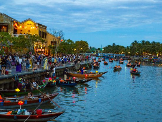 ホイアン旧市街散策、夕食(ホイアン3大名物料理を含むベトナム料理)、灯篭流し。ナイトマーケット散策