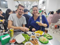 パリッと焼き上げた米粉のクレープ(バインセオ)と、レモングラス香る豚肉串(ネムルイ)を自分で巻いて楽しみ、名物のピーナッツソースにつけていただきます。