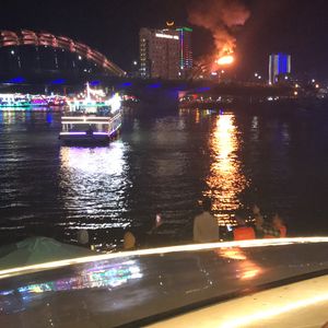 港に並ぶ派手な船達の1つに乗り込み、ドラゴンブリッジまで川を下り、一度橋の下を潜り抜けて観覧車を観ながら各船Uターン、所定の停泊位置があるのか、色んな船が橋の下に並び、ショーの開始、