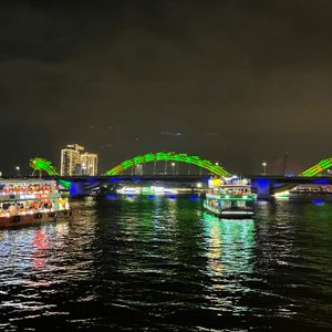 21時になると、ショーが始まり船内のデッキに出て鑑賞することができました。ショー自体は、そこまで迫力のあるものではありませんでしたが、ガッカリするほどでもありません。普通に交通量のある橋の上だしこんなもんか~という感じです。ドラゴンがコンパクトに火を吹いています。ガイドさんも優しく、気さくな方で初日のイベントにピッタリでした。週末のみの特別感もあり、楽しめます!