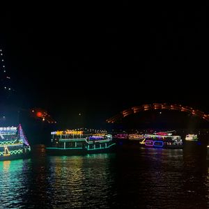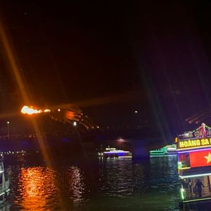 ハン川にはたくさんの船が横付けされていました。乗船するとすぐにディナーとダンスショーが始まりました。食事は揚げ春巻きやエビ串焼きなど美味しかったです。対岸のビルはライトアップされ、ゴールデンブリッジもとてもきれいでいい思い出になりました。