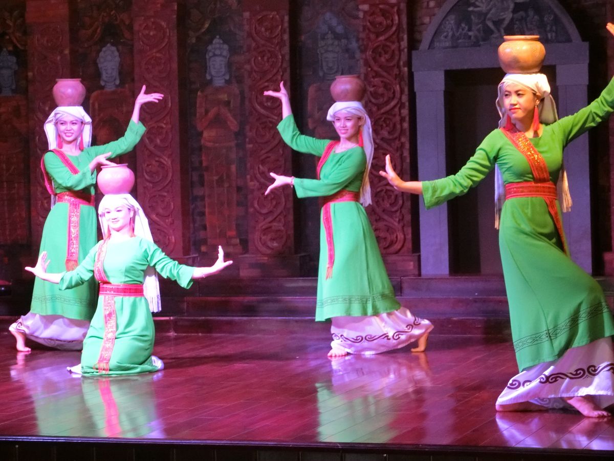 遺跡にはダナン市内から1時間余りで到着します。遺跡の入り口から5分あまり歩いた後、電気自動車に乗り、しばらく歩いてから民族舞踊のステージを見学。その後、再び歩いて遺跡を見