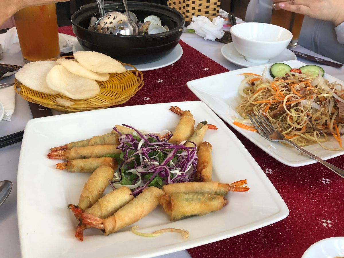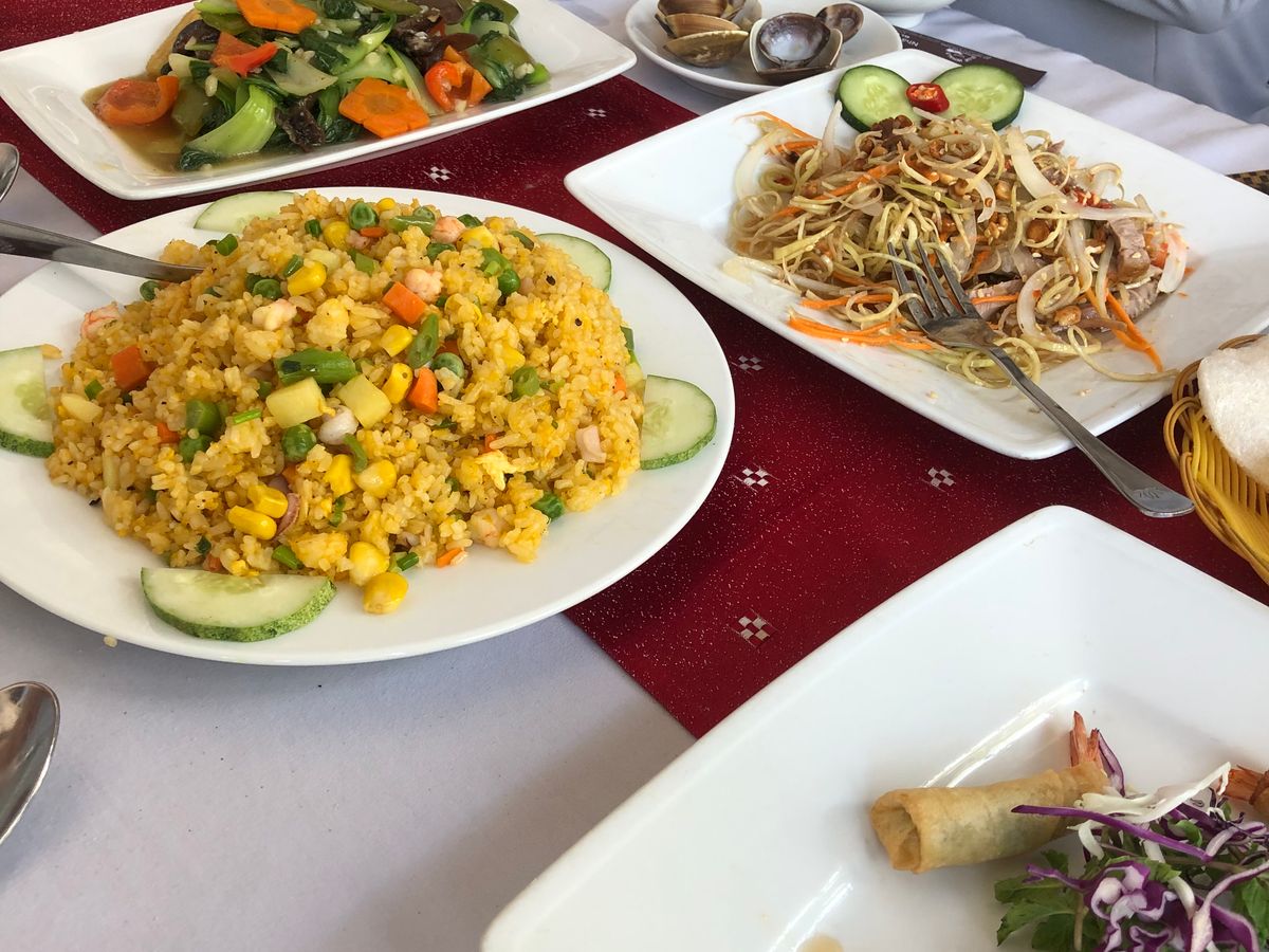 おすすめされる海鮮レストランで出される標準的なコース(バナナの花スライスサラダ、ハマグリのレモングラス蒸、エビのミニ春巻き、イカの焼いたの、チンゲンサイ炒め物(空心菜の時もあるのかな)、海鮮チャーハン(黄色いパラパラごはん)、果物(ランブータンでした)。