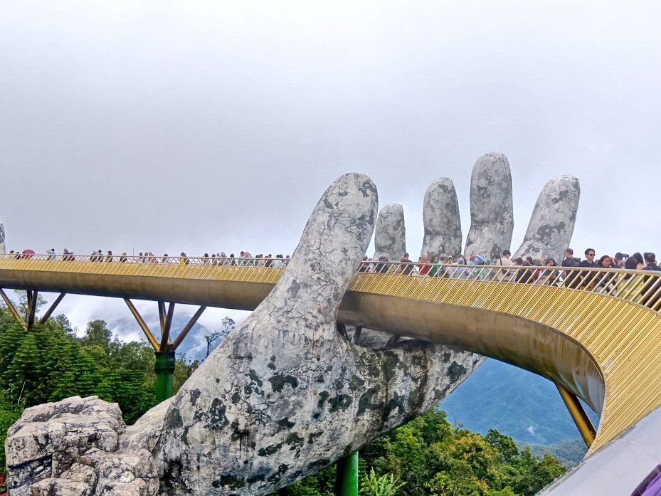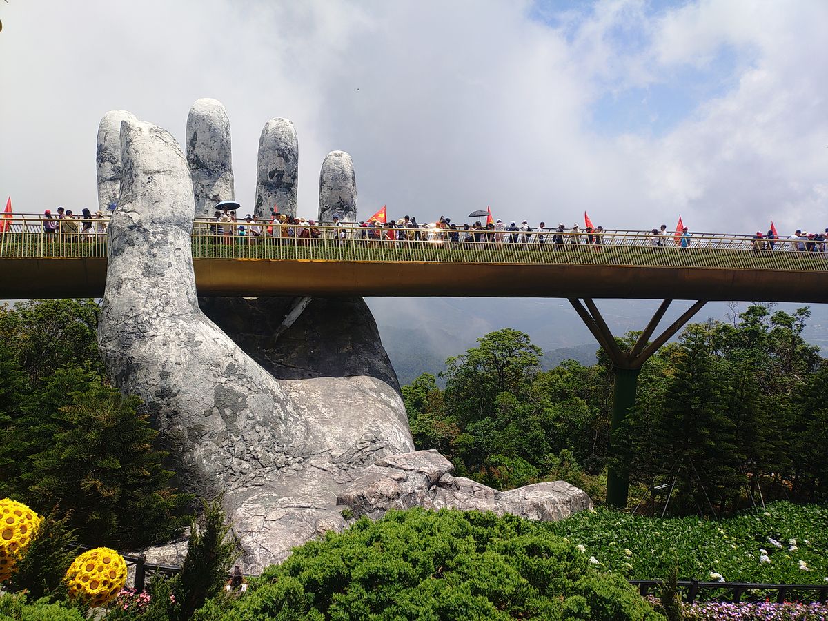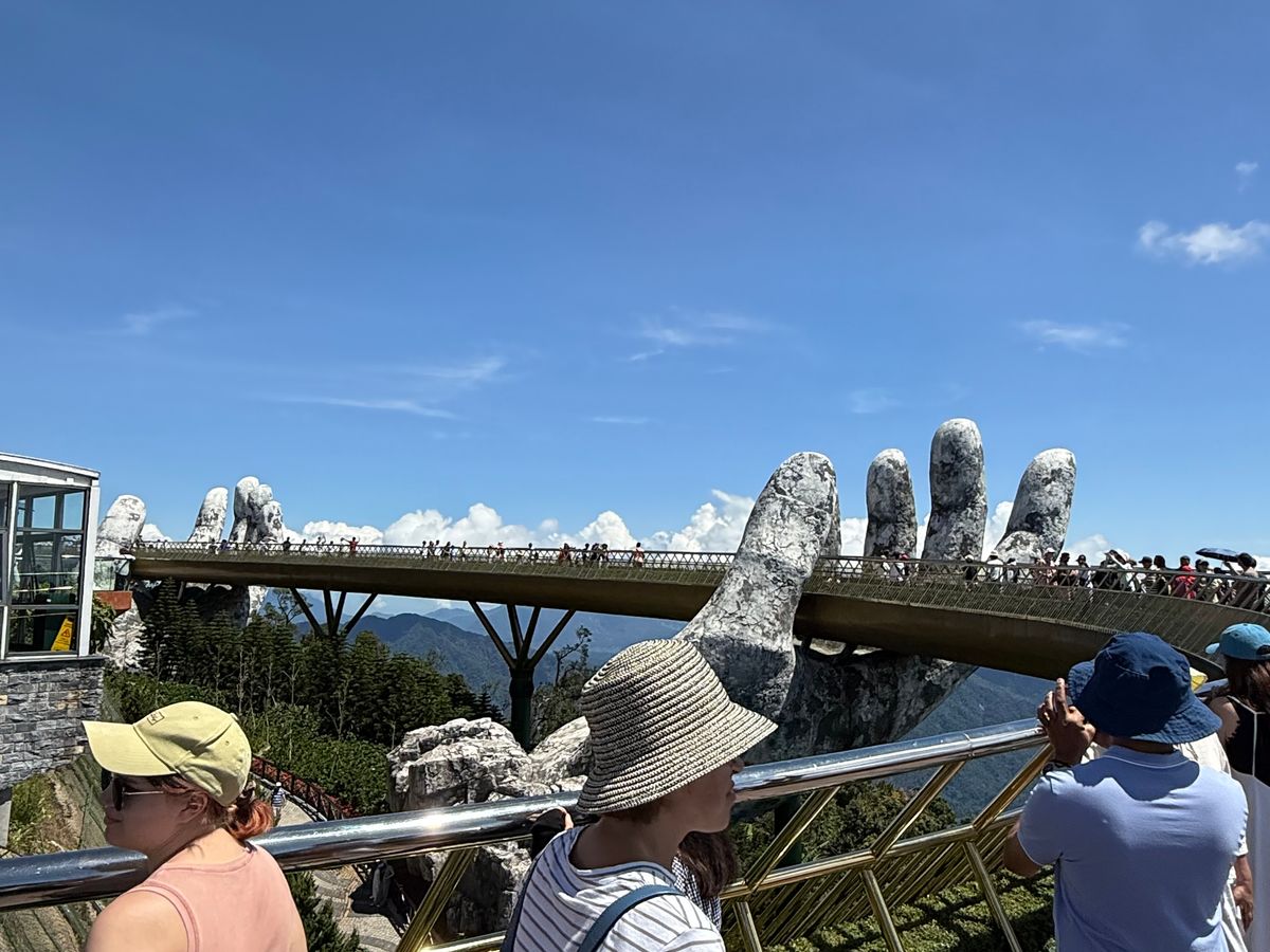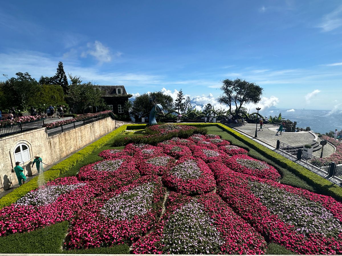 7:30にピックアップ。私達だけ参加のツアーです。長いロープウェイにはハノイの可愛い家族と私達とガイドさん。ダナンの方とハノイの方とではチケットの値段が違うようです。勿論外国人が1番高いらしいがこれは当たり前です。写真見て頂ければわかりますが、紙の手も空いてて気持ちが良かったし、花が綺麗な場所も空いててとても綺麗でした。ガイドさんが順次良く案内してくれます。フランスエリアは自由行動です。ランチは美味しいのを探すのが大変でした。ランチ無しにしてほしい。小地ビール2杯他の建物でもらえます。