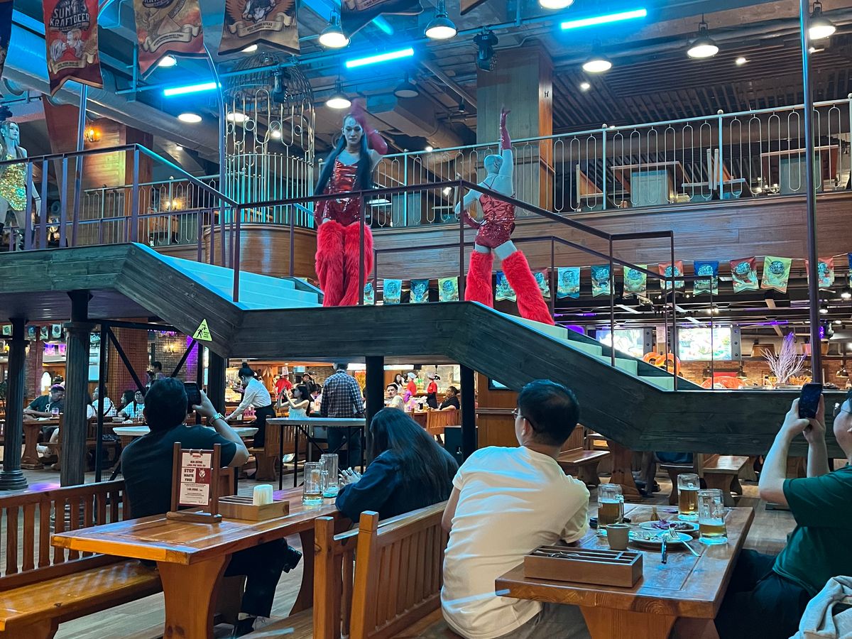 夕方入場プランということで、太陽が沈んでいく過程とバーナーヒルズから見下ろす風景のコントラストが最高にきれいだった。頂上では1時間程度のフリータイム、その後ビール醸造所にあるレストランで、マドンナ・レディーガガ系のショーを見ながらブッフェ。大ジョッキ2杯分のチケット付きでした。