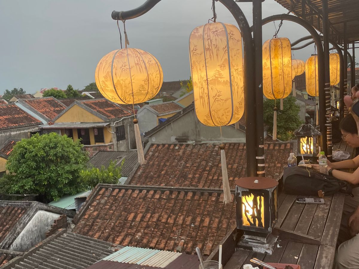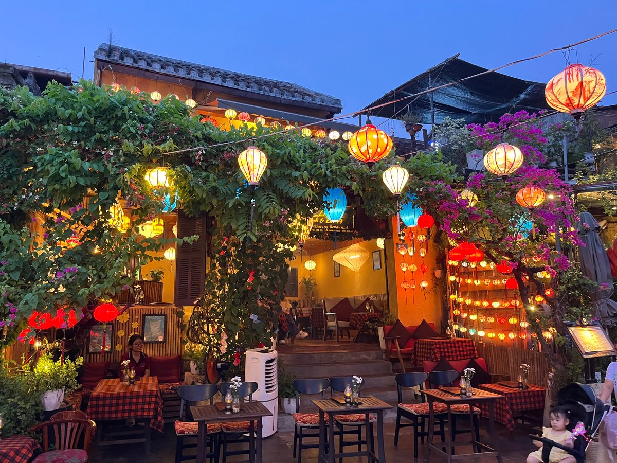 夕食は、かつて安倍首相が来店したレストランでいただきました。夕暮れのホイアンを眺めながら食べるベトナム料理は格別でした。夜のホイアンは灯篭やランタンの明かりがとてもきれいで幻想的でした。異世界に来たような雰囲気がありました。