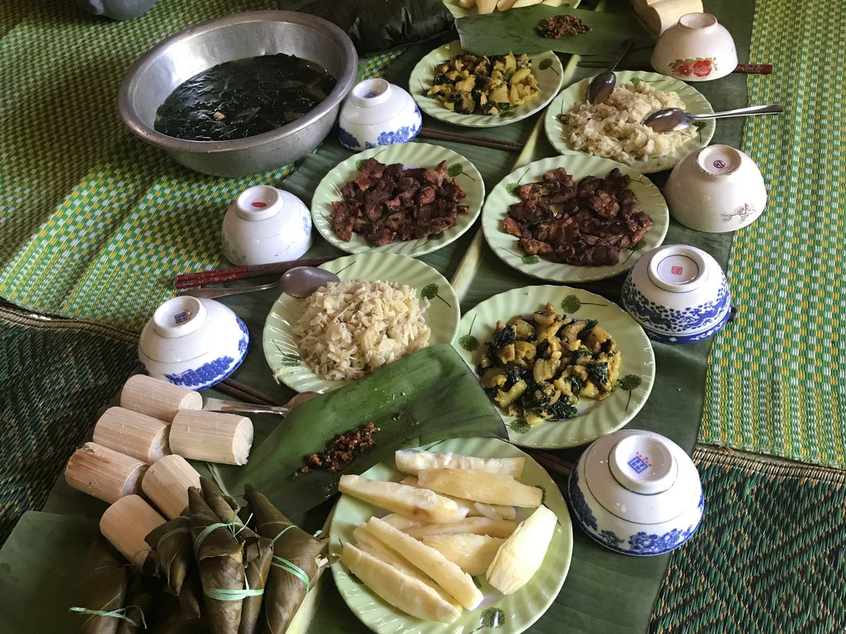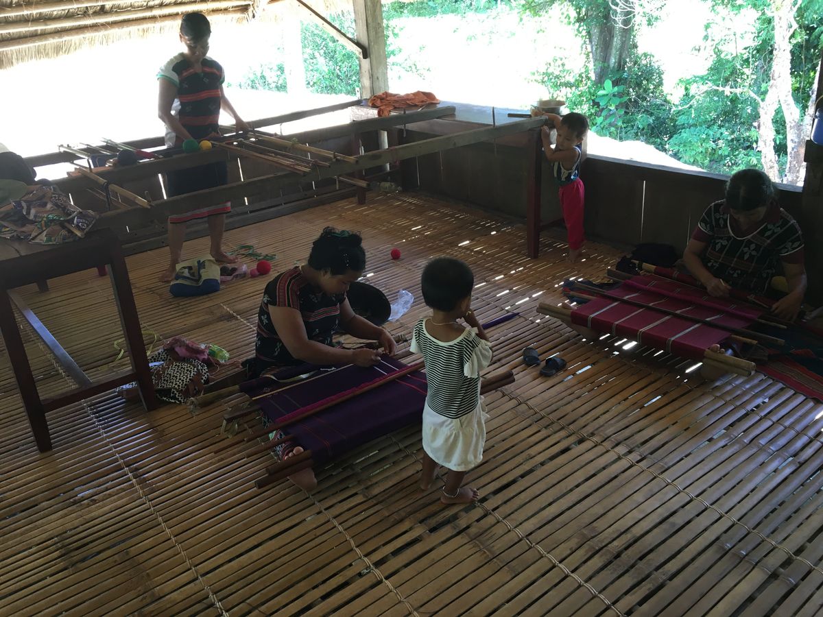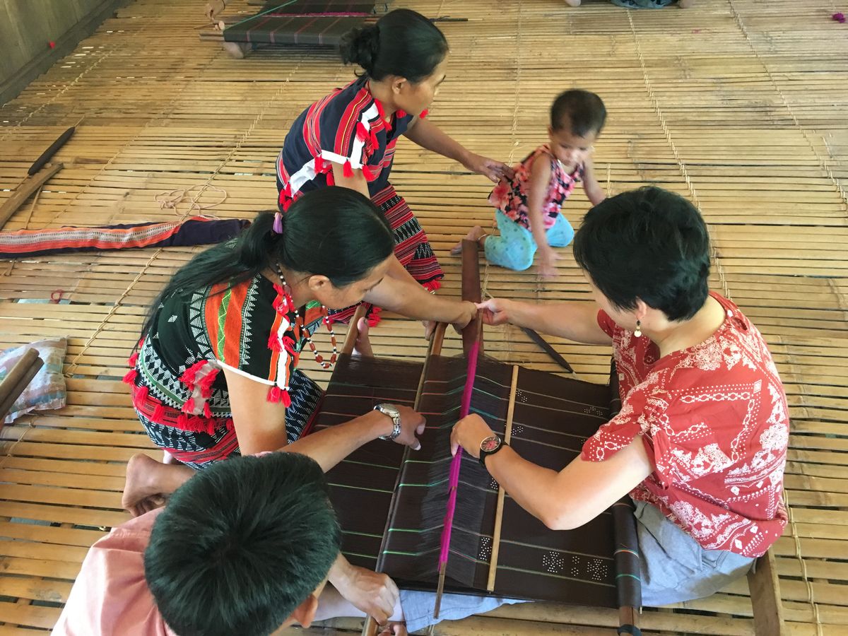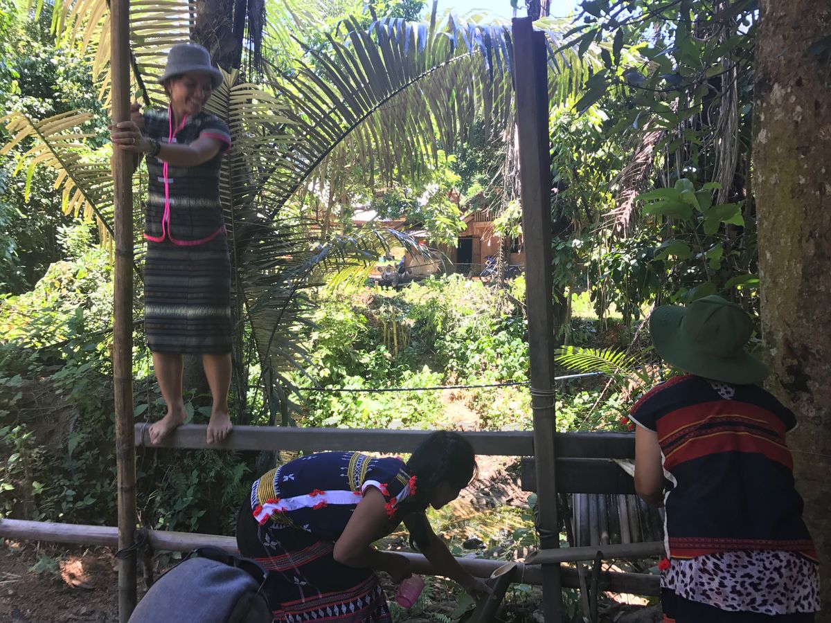 カトゥー族の村に到着するやいなや、10人ほどのカトゥー族の女性達に出迎えられ、村の集会所でお話し聞き、一緒にダンスをしたりして楽しみました。その後、村の中を案内され、狩の仕方や薬草などについて学びました。さらに籠編みやサトウキビジュース作り、米の脱穀などを体験しました。昼食もご馳走になりましたが、日本人に合う味でとても美味しくいただけることができました。カトゥー族の皆さんはいつもニコニコされており、よく笑い、とてもフレンドリーで至福のひと時を過ごすことが出来ました。