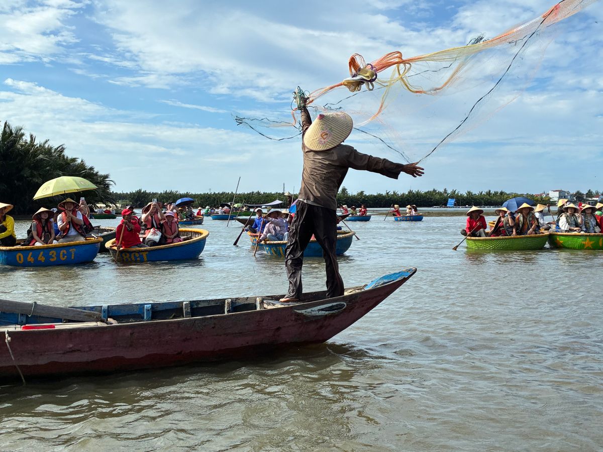 川沿いがすべてこのボートの業者で埋め尽くされてる感じです。狭いところから広けた場所に下りでると、他のボート業者の観光客のボートで過密状態でした。そこでボートをぐるぐる回してくれるボート(有料)に乗るかどうか聞かれます(任意) 。そのあとココナッツボートに乗った知らないおっさんのカラオケを聞かされ、ツアー用に用意された漁師さんが網を投げ入れるとこを見て終わりです。