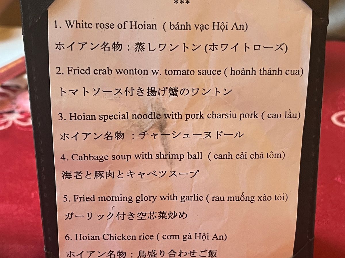 ホイアンまでの道中、ベトナムの色々な話しを聞かせてもらいました。昼間は暑かったですが買い物やカフェ、ホイアン名物のランチなど大満足でした。ランチは量が多くて食べきれないくらいでした。