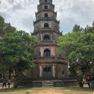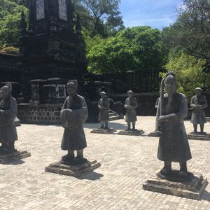 朝7時、ダナンのホテルを出発、途中トイレに寄って湖の写真を撮ったらまたフエへ向かいます。(トイレはまあまま綺麗だしペーパーもあるので女性でも安心です。)トンネルを使うので2時間半もかからずフエに到着しました。時短になるのでトンネルの方がおすすめです。午前中は3つの帝廟をじっくり見て回ります。暑さに参りましたが涼しい休憩所もありました。お昼ご飯は綺麗な庭園の中にあるレストランで宮廷料理を頂きました。見た目は綺麗ですが味は普通で無感動でした。特に亀さんの形をしたチャーハンは味がしませんでした。揚げ春巻きは美味しかったです。レストランには日本語を話すお姉さんがいて食べ方を日本語で説明してくれました。昼食後はいよいよ王宮です。王宮は見ごたえのある建造物なのですが、広すぎるし暑すぎるし、ここはカートに乗って代表的な部分だけをカメラに収めて終わりにしてもらいました。そしてドラゴンボートでリバークルーズです。ドラゴンボートは貸し切り状態、川面を渡る風が心地良いです。船の中で可愛い男の子がお土産をすすめて来ますが、一番安そうな物を買ってあげて下さい。数百円の事でとても喜んでくれます。ボートを降りて目の前のティエンムー寺へ移動、ここは想像より立派で良いお寺でした。順調に全工程を消化し、ダナンへ戻る時間となりました。ダナンの中心街に入ると「花祭り」の影響で市街がすごい事になっていましたが天才ドライバーさんの天才的なテクニックのお陰でなんとか脱出、無事にレストラン「ブルーホエール」に到着できました。シーフードの夕食ですがここも味は普通で無感動でした。量は十分多いです。海も見えるし、まあこんなもんでしょう。夕食後、ホテルへ送ってもらい終了です。日本語ガイドのロンさんは大人しくてとても優しい方でした。日本語もお上手で説明も丁寧です。朝、道中で冷たいお水を買ってくれました。タイトなスケジュールなのかと思いきやそうでもなく、途中でカフェに入る余裕もありました(カフェではロンさんが注文してくれます。)トイレも綺麗な所を選んでくれるので安心です。ダナンから遠いのでどうしようと迷っていたのですが、窓から外を眺めていたらあっという間でした。世界遺産の良い思い出が出来たので行って良かったです。長い長い1日でしたが優しいロンさん、天才ドライバーさんありがとうございました。どうせ遠くまで行くんだから全部見て回りたい!という方にはぜひおすすめします!!