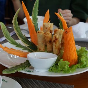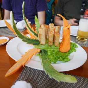 昼はフエ中心部のレストランでツアー客全員で長テーブルについてみんなでシェアする形。味も微妙で、ほぼ全部シェアっていうのが…。ブンボーフエが昼食とありますが、ブンボーフエはお茶碗くらいの大きさでふた口ぐらいのサイズなので、期待はずれ。1人メイン一品は事前に選ぶ形にしたりできなかったのかな…とは思ってしまった。