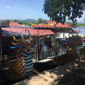 王宮は広いし、自由時間20分であっという間。すぐに集合でもっと歩き回りたかった。そこが残念。お寺は生の読経が聞けたり雰囲気がよかった。サンセットクルーズは、ドラゴンボートに乗るのだが、ボートが操縦してる方=所有者の家も兼ねてるらしく、前の部分を座席に、後ろはその家族の居住スペースになってて前には行けるけど後ろには行けない。なのに、太陽が沈んでいくのが船の後方で、乗ってるときはたんだん薄暗くなる空と川を見るだけでやることがない。降りてやっと太陽が沈みかけなのが拝めた。