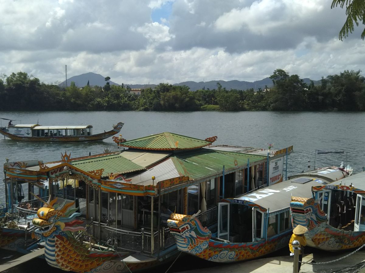 ティエンムー寺のすぐ側から、ドラゴンボートに乗り20分ほど両岸の家々を眺めながら王宮へ向かいました。ドラゴンボートはエンジン音が大きく少し疲れましたが、岸辺の人々の暮らしの気配が感じられて楽しくもありました。船の中ではお土産や飲み物も売っていました。