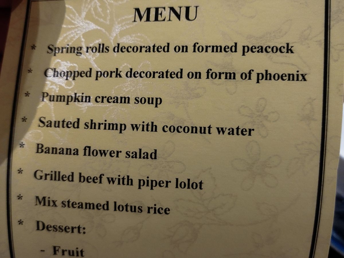 このツアーで一言あるなら、「フエ王宮風宮廷料理昼食」の名前はツアー名から削除した方が良いと思います。実際の昼食はフエの家庭料理かな…。期待させておいて裏切られるぐらいなら、最初からベトナムフエの郷土料理です、くらいに留めておいた方がいいと思います。