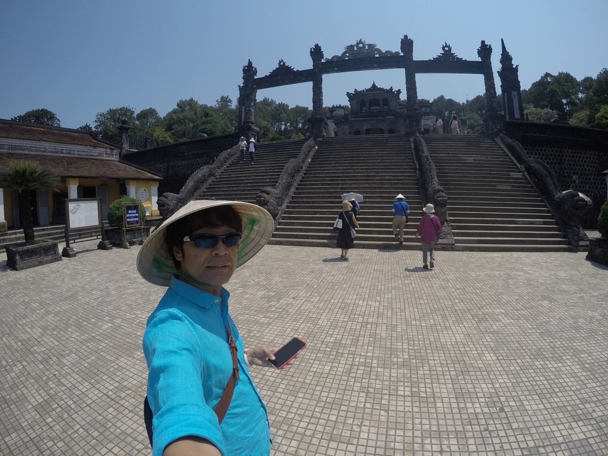 ダナンから参加、しかし遠かった。片道2時間です。ホテルで頼むドライバーは、混沌な運転で疲れるが、ツアーのドライバーは無理な追い越しをしないので、安心して座っていられるし、疲れがすくなかった。しかしフエの王宮は遠かった。途中日越経済協力で完成したトンネルを越え、フエへ。トンネルを抜けてから一時間。田園風景を楽しみつつやっとカイディン帝廟に到着。日本のビール瓶を装飾に使ったとは、合理的というべきか、もっと他の意味があったのか。日露戦争の勝利で勇気づけられたベトナム人の中には、フランスからの独立運動が起きた。象徴的に使ったのかもしれないと、想像したりしながら苦渋の生涯を送ったカイディン帝に思いをはせた。