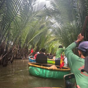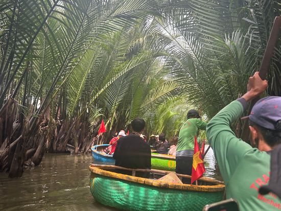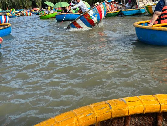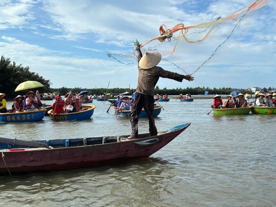 川沿いがすべてこのボートの業者で埋め尽くされてる感じです。狭いところから広けた場所に下りでると、他のボート業者の観光客のボートで過密状態でした。そこでボートをぐるぐる回してくれるボート(有料)に乗るかどうか聞かれます(任意) 。そのあとココナッツボートに乗った知らないおっさんのカラオケを聞かされ、ツアー用に用意された漁師さんが網を投げ入れるとこを見て終わりです。