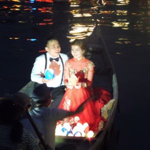 灯籠流しができるポイントはベトナムの方にも人気のようで、よく結婚式の写真撮影に使われるそうです。この日も二組のカップルが小舟の上で撮影をしていて、流れる灯籠と相まってとてもきれいでした。白いアオザイにカラフルな灯籠は絵のようで美しかったです。