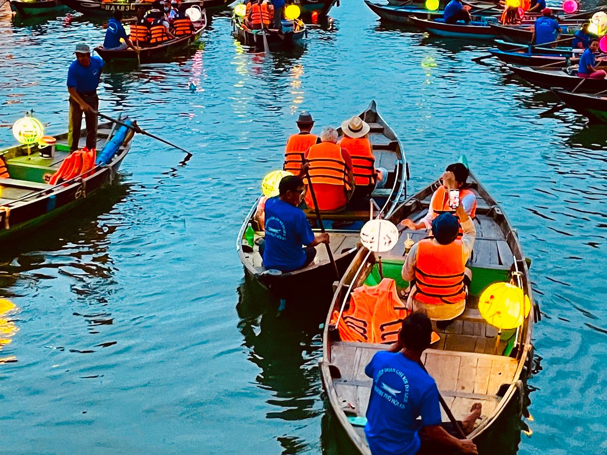 夕刻間近に最後の観光地ホイアンに到着、テラス席から街が見渡せるレストランでご当地名物の夕食をいただきました。その後灯籠流しを体験、夜の街並みと夜市の散策で日程を終了。
