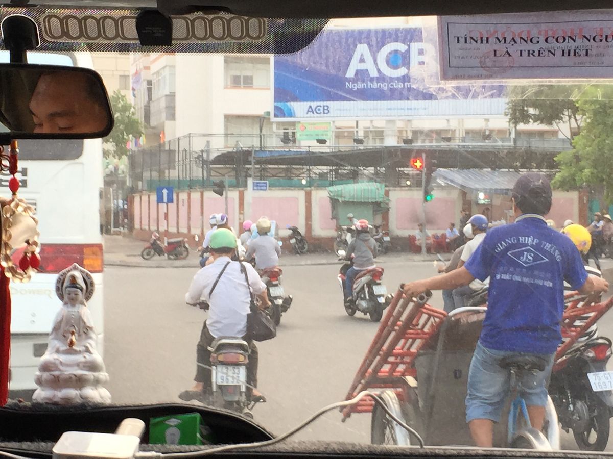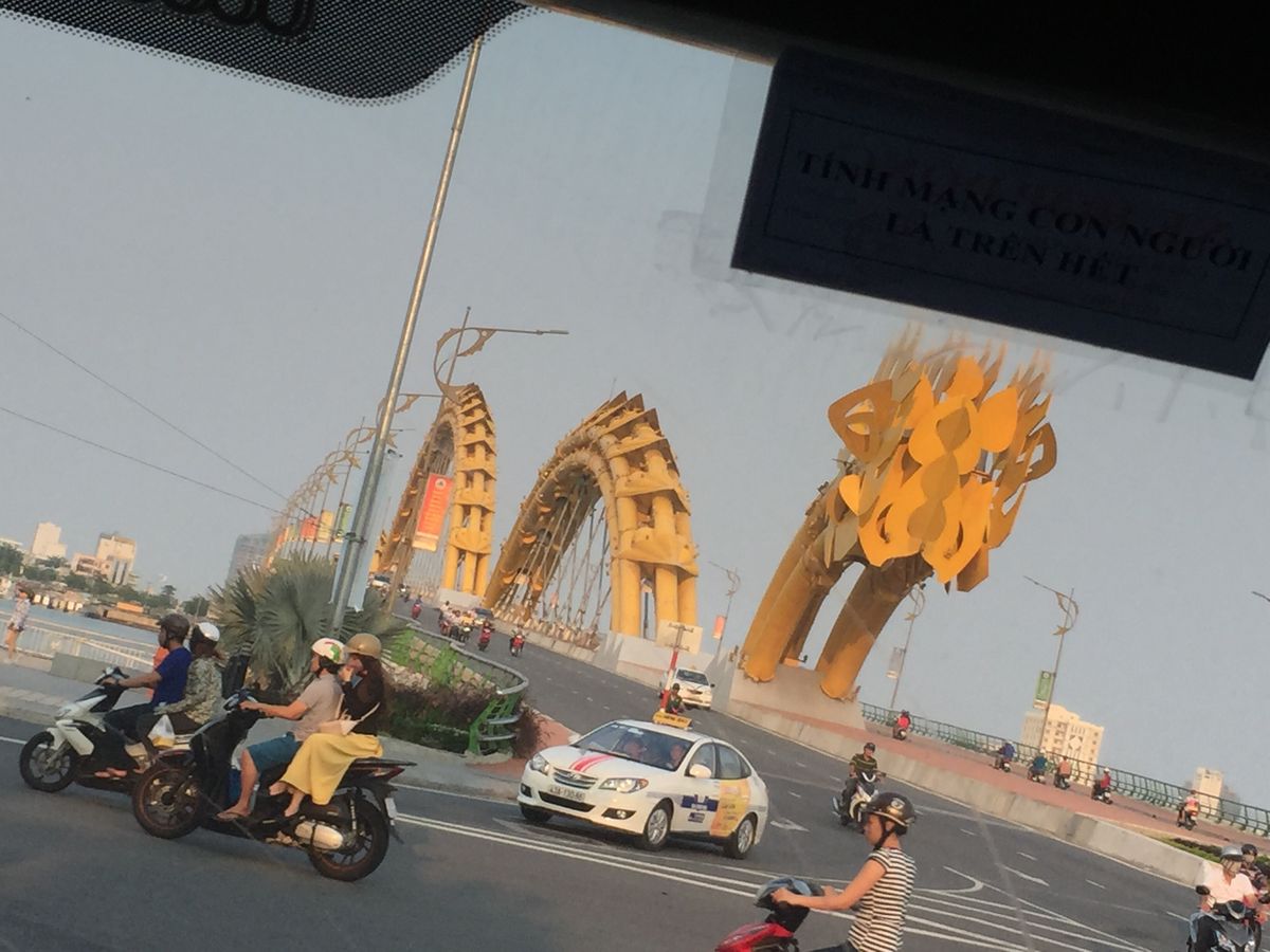 ダナンはホーチミンより道が立派で、道幅も広く路面もきれい。前日タクシーでホイアンに行った時は、助手席に乗るとマリオカートのゲームのようにバイクや対向車が突っ込んで来るなか、こちらも半分対向車線に乗り出しながら前の車を抜きながらのレース状態がおもしろいようでもあり怖くもあった。このツアーの運転手さんはとても上手だし、路面が荒れるときや少し段差がある時はとてもゆっくり丁寧に走ってくれ、その心遣いが嬉しかった。