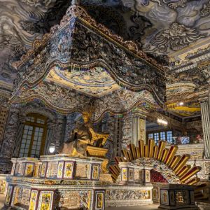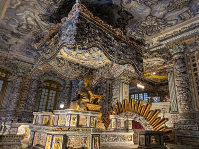 このツアーの始まりは、グエン王朝最後の帝廟のカイディン帝廟の見学でした。ガイドさんによれば、カイディン帝はフランスかぶれで浪費家だったため、多くの国民から受けましたとのこと。しかし、その陵墓は豪華絢爛で独特の外観で、皮肉にも、現在フエに残るいくつかの帝陵の中では、カイディン帝陵が一番人気だとのこと。その後、ティエンムー寺近くの岸辺までフエ名物のドラゴンボートに乗ってフォーン川を眺めながらのミニクル一ズはとても良かったです。ツアー説明文では、この後昼食とありましたが、ティエンムー寺からグエン朝王宮まで移動し、王宮を見学しました。ガイドさんの話ではベトナム最後の王朝が置かれたグエン朝王宮は、 ベトナム戦争でその大半が大破されたが、現在は修復が進んでいるとのことでした。破壊といえば、2025年の5月にベトナム人によって、国宝の王座が破壊されたために、その一角は立ち入り禁止になっていました。王宮の広大な敷地面積を歩いていると、歴史の重みを感じることができます。また、ガイドによれば、王族の姓である「グエン」が特別視され、多くの人がこの姓に改名したため、現在でもベトナムで最も多い姓とのことで、とても興味深い話が聞けました。遅めの昼食は、「イータオガーデン」でフエ王宮料理を食べました。この店の名物の「孔雀の形をした春巻き」はインパクト大でした。そして、私達は夜のフライトまで時間があったので、スパに案内してもらい、マッサージが終了したタイミングで、このツアーのドライバーさんに空港まで送ってもらいました。ありがとうございました。