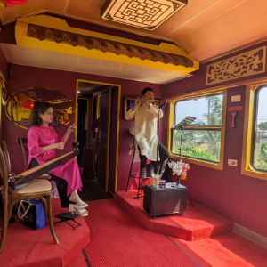 車内では、ベトナムの伝統的な民族楽器の生演奏が響き渡り、旅情を誘います。特に驚いたのが足湯のサービス(約360円)。歩き疲れる前のリフレッシュとして最高に気持ちよく、食堂車で飲み物や軽食を買い、車窓の緑を眺めながら過ごす時間は、まさに至福のひとときでした。