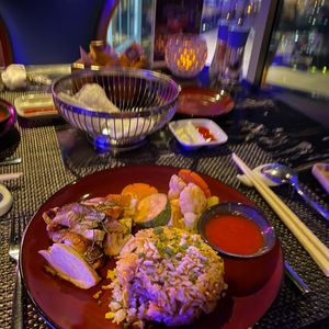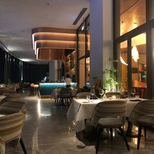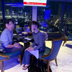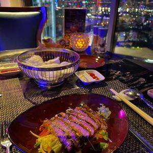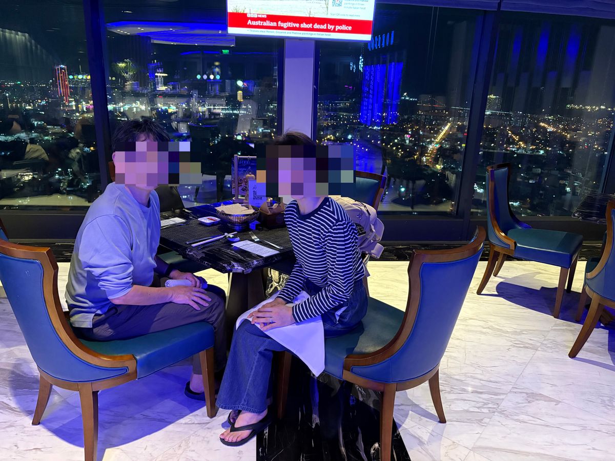 すっきりしたところで最上階のクラブっぽいレストランへ。レストランの眺め(夜景)は綺麗でした。レストランはガラガラでしたが音楽、音響が少々うるさいです。